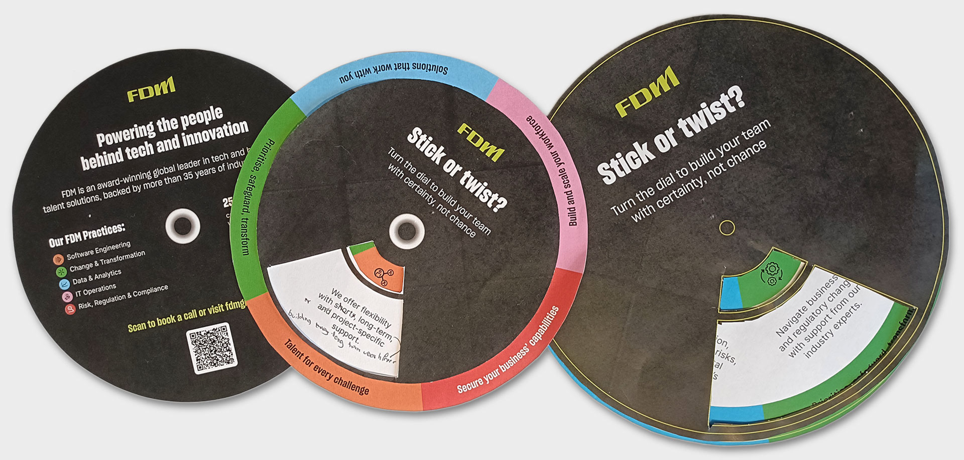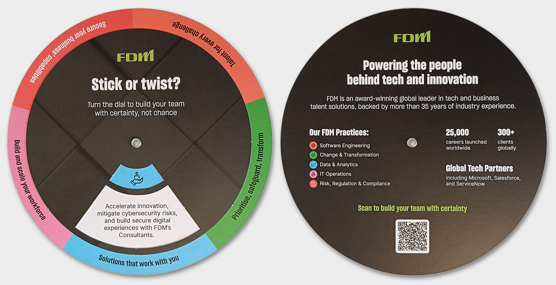 The final volvelle design reveals information unique to each of FDM's five Practices as the upper dial rotates. Spinning freely and securely thanks to a central grommet, the background adopts the block tower texture for consistency, whilst the reverse contains additional detail and the CTA.