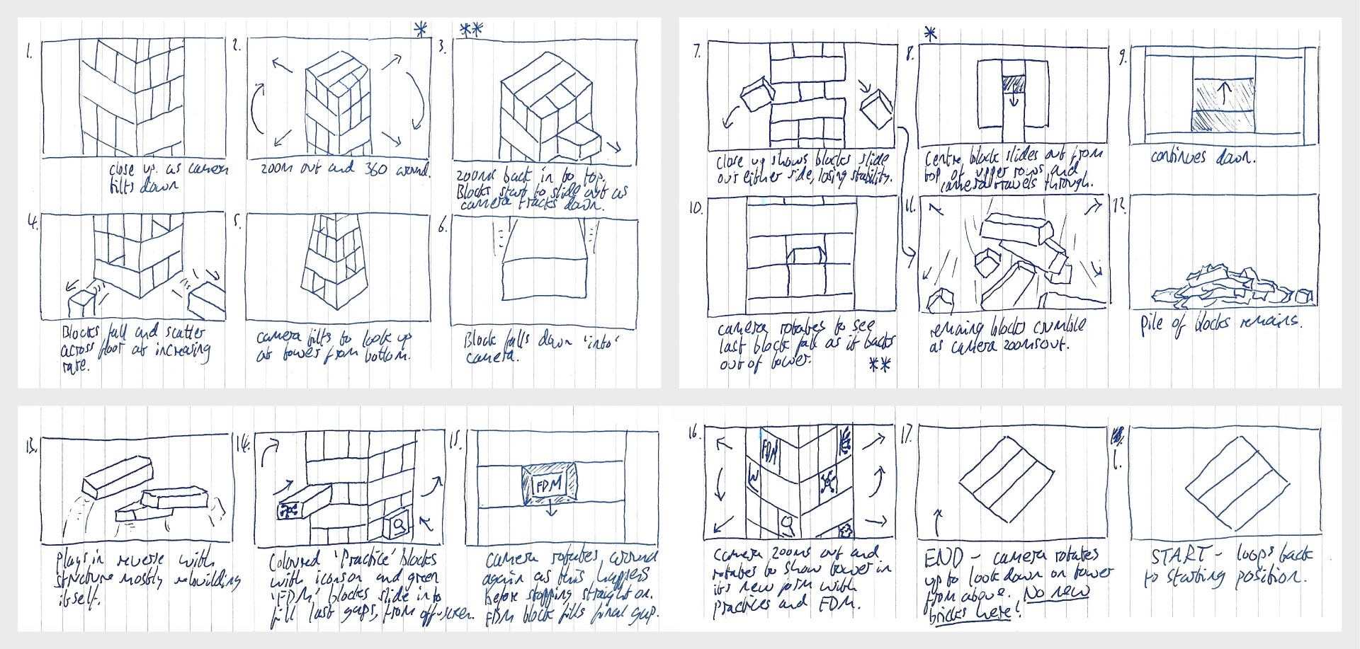 Adhering to budget constraints, a digital looping animation was produced that could utilise existing hardware, projected across the FDM auditorium. A 3D block tower was crafted in Blender with compromised structure, demonstrating risk of collapse and, in turn, the stability FDM can offer. Alongside this a merchandise kit was produced for attendees, including a branded FDM mini-'Jenga' and rotating 'volvelle' leaflet, alluding to a roulette.