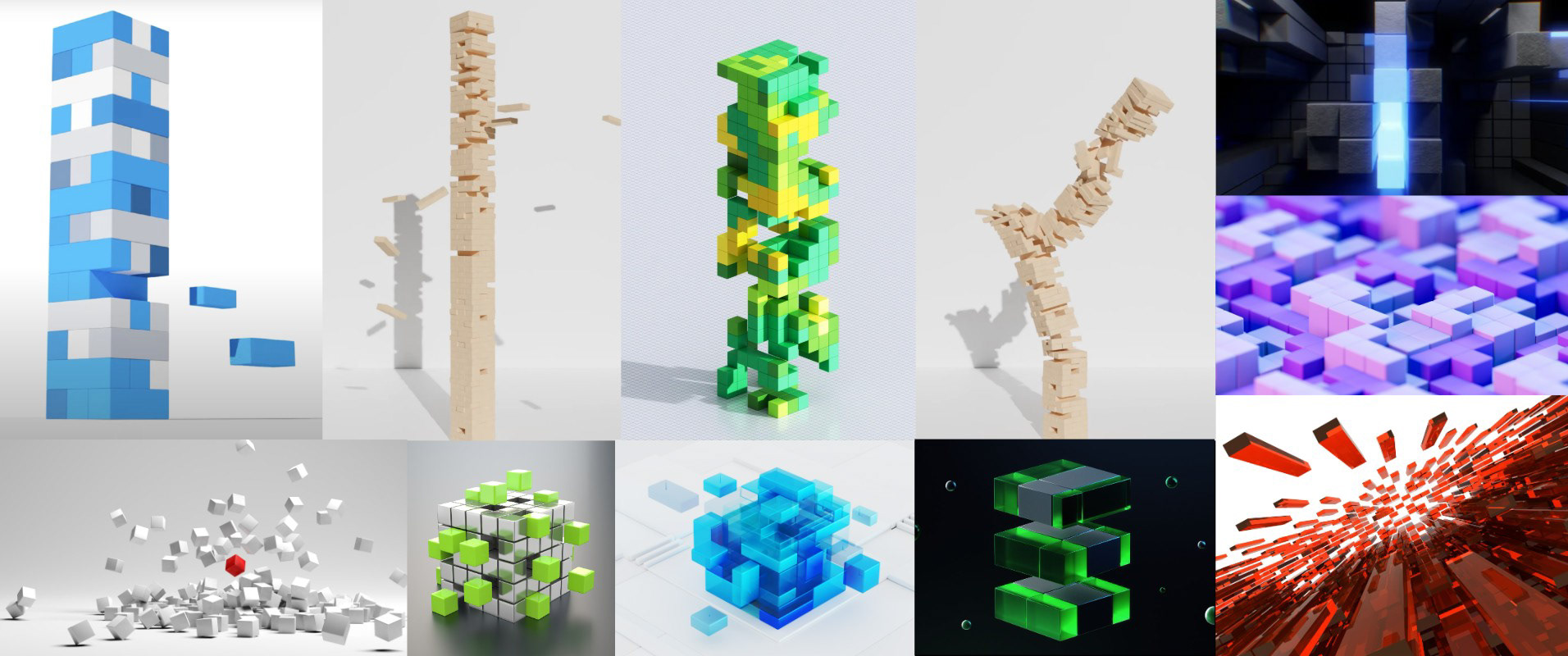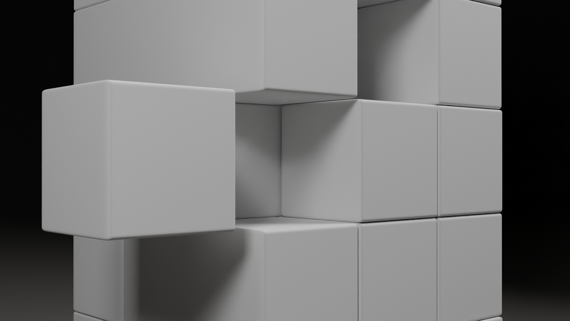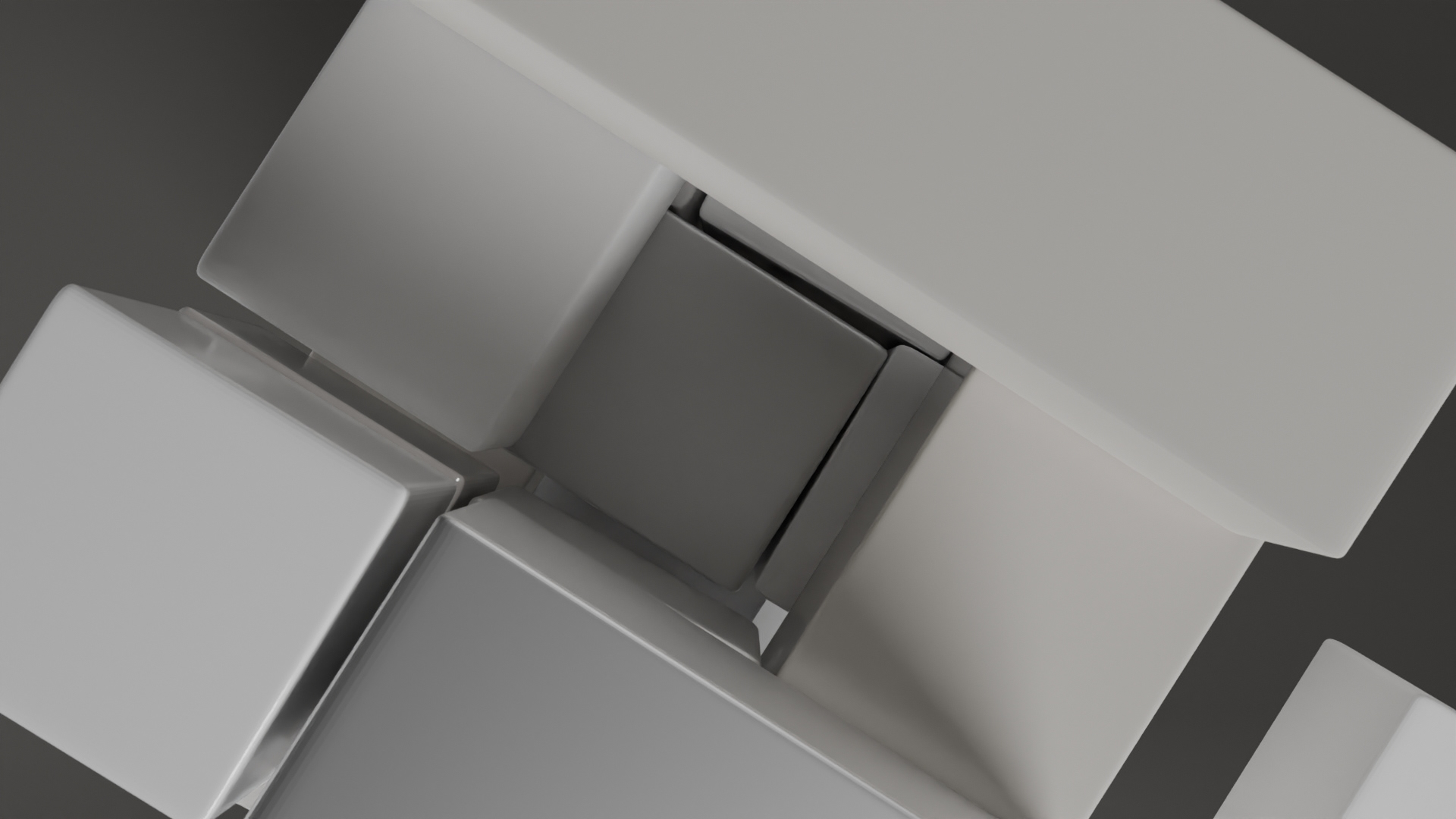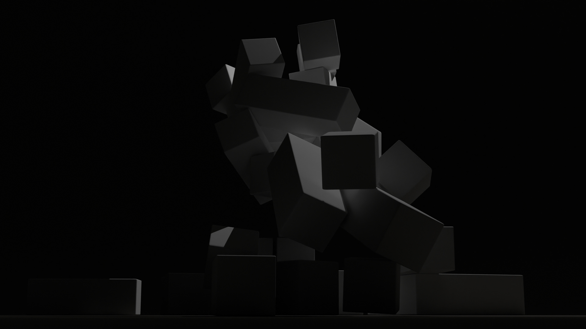 The final animation showcased within the London centre auditorium. Initially assuming an offset and unstable formation, the tower collapses before rebuilding, solid and complete courtesy of FDM literally filling the (skills) gaps. A variety of monochrome textures were used throughout the build: glossy, matte, metallic and glass, granting unique reactions to the surrounding light and contrast with the vibrant, glowing FDM blocks.