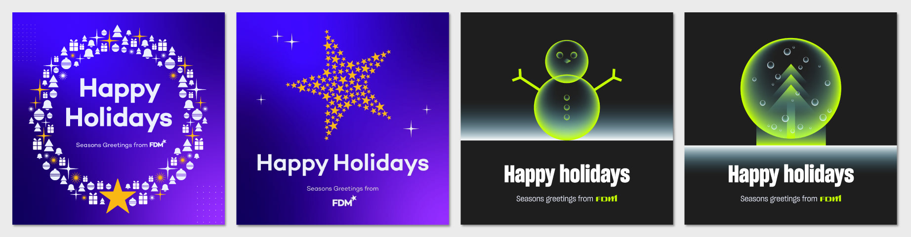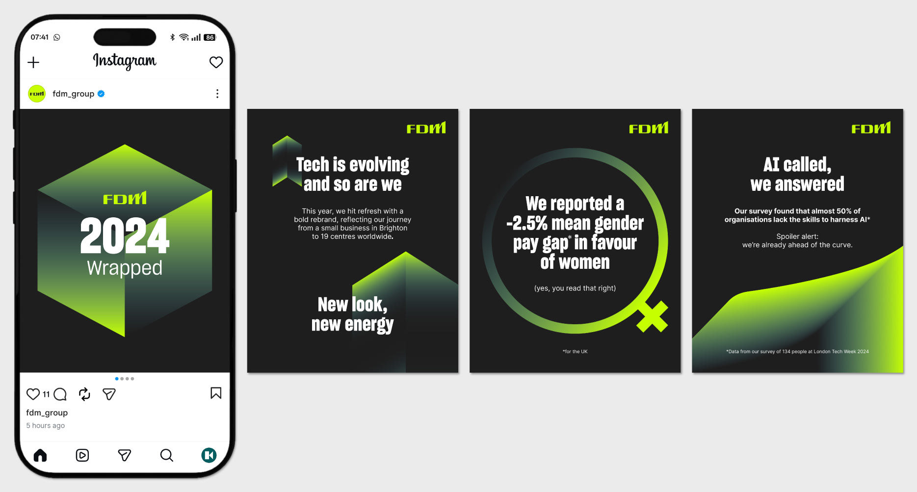 Mimicking the trend of Spotify Wrapped, FDM released their own annual statistics for 2023 and 2024. Uniquely posted either side of a rebrand, the former attempts to align with Spotify's art direction, using soft gradients and pixelated shapes, whilst the latter boasts its new identity, utilising gradient icons to reflect and reinforce the copy.
